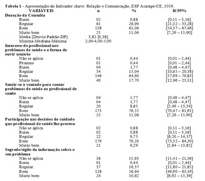 A Satisfação dos Usuários no geral foi boa, sobre a avaliação dos pontos chaves: Relação e Comunicação e dentre as perguntas que a compõem, o que alcançou a resposta “Bom”, foi “Participação nas decisões do cuidado que profissional de saúde lhe prestou” 79,20% (n = 179) e 76,55% (n = 173) dos usuários expressaram “Bom” “Sentir-se a vontade de contar os problemas de saúde”.