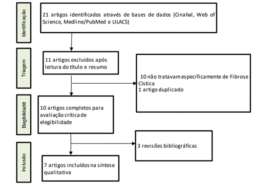 A partir da busca nas bases de dados, o método de seleção e de inclusão dos estudos ocorreu seguindo as seguintes etapas: primeiro, leitura de todos os títulos e resumos, um total de 21 produções científicas. Nesta etapa foram excluídos 11 artigos, dentre estes, 10 por não tratarem especificamente sobre transição de cuidados e Fibrose Cística, e 1 por duplicidade. Em seguida, procedeu-se a leitura na íntegra 10 artigos, destes, 3 foram excluídos por se tratarem de revisões bibliográficas e 7 produções foram incluídas neste estudo.