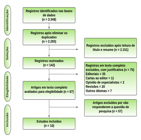 A partir dos critérios estabelecidos, foram selecionados dez artigos para compor esta pesquisa. O percurso da busca e seleção dos estudos encontra-se detalhado no fluxograma da Figura 1, adaptado do PRISMA(19).