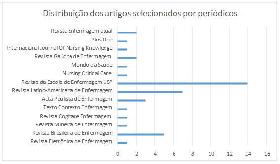 A revista científica que apresentou a maior quantidade de publicações com o tema deste estudo foi a Revista da Escola de Enfermagem da Universidade de São Paulo (USP) com 14 publicações correspondendo a 29,16% do total das publicações. Em seguida observa-se a Revista Latino-Americana de Enfermagem com 7 publicações (14,58%) e em terceiro lugar tem-se a Revista Brasileira de Enfermagem com 5 trabalhos publicados (10,41%).