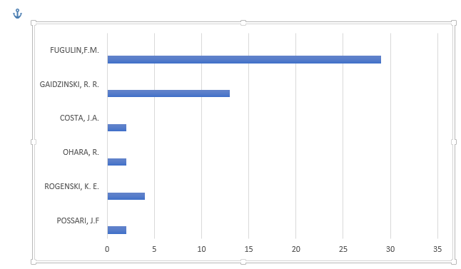 A identificação dos autores que mais publicam sobre um determinado assunto é importante para se reconhecer os grupos de pesquisa e pesquisadores de maior expressividade na área. A Figura 3 apresenta os 6 autores que mais contribuíram para a produção científica voltada para o SCP de Fugulin.