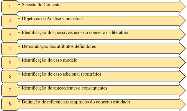 Trata-se de um Análise de Conceito de Classificação de Risco para Enfermagem em serviços de Emergência, seguindo o modelo proposto Pelos autores(6), que apontam oito passos, conforme figura 1, e que serão descritos individualmente para sua concretização.