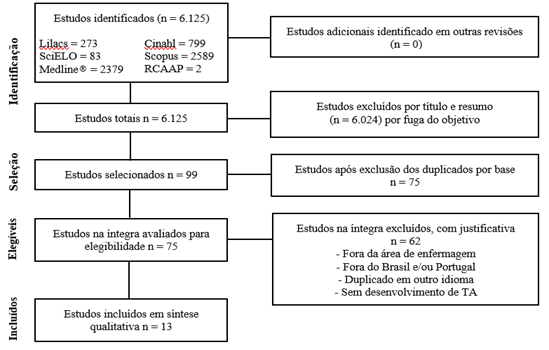 Os critérios de inclusão considerados foram artigos originais, teses, dissertações ou Trabalhos de Conclusão de Curso, da área da enfermagem, realizados no Brasil e/ou Portugal, disponibilizados na íntegra, nos idiomas português, inglês e espanhol e publicados a partir do ano de 2004. O critério do ano baseia-se na criação da Rede de Tecnologias Sociais (RTS). Foram excluídas revisões integrativas ou sistemáticas, relatos de experiência, relatos de caso, editoriais e estudos que não eram elaboração ou aplicação de TA.