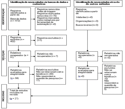 Em um primeiro momento, foram encontrados 27 estudos mediante a identificação sobre a temática pertinente ao estudo nas bases escolhidas. Assim, foi possível selecionar e incluí-los conforme apresentados no fluxograma da figura 1.