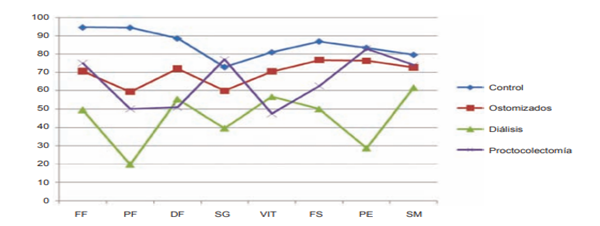 Autores como Charrúa-Guindy et al. (2011) também apresentam uma figura (Figura 2) que expõe dados acerca da mensuração da QV de pacientes ostomizados na Unidade de Coloproctologia de um Hospital Geral do México(15). Dentre as informações, fica evidente uma constante variação entre a Disposição Física, Presença de Dor, Saúde Geral, Vitalidade, Função Social, Papel Emocional e Saúde Mental.