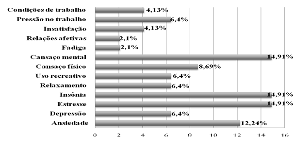 O cansaço mental (14,91%), insônia (14,91%) e estresse (14,91%) foram apontados como os fatores que mais motivaram o uso/abuso de substancias psicoativas entre os participantes, como apresentado no Gráfico 1.