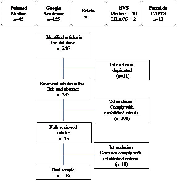 A total of 246 publications were identified, with Pubmed searching 45 studies in MEDLINE, the VHL tracking two 2 in Latin American and Caribbean Literature in Health Sciences (LILACS) and 30 in MEDLINE, Google academic were 155, in Scielo one and 10 dissertations and three theses on the Capes Portal. The final sample consisted of 16 publications. Figure 2 shows the stages of sample composition.