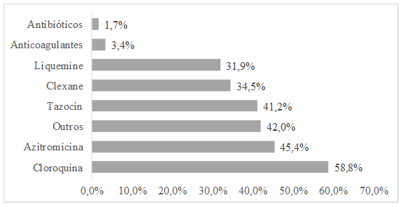 Os achados do estudo estão também em desacordo com uma revisão sistemática e metanálise realizada com um total de 2401 pacientes de 15 estudos, o qual também evidenciaram que as abordagens de tratamento mais comuns foram os antivirais (79,4%) e os antibióticos (77,7%)(21).