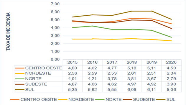 Em relação à taxa de incidência, a maior foi verificada em 2018 (4,79) e a menor em 2020 (3,61). A taxa mantém valores aproximados nos três primeiros anos da série e um discreto aumento no segundo triênio, com uma diminuição mais acentuada no último ano, conforme Figura 1.