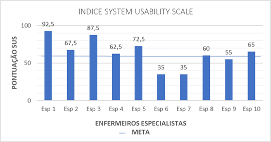 A meta de classificação utilizada foi de um escore de 65 pontos na escala, podendo alternar os valores de acordo com as respostas dos especialistas. Observou-se que, dentre as respostas das especialistas, cinco delas obtiveram respostas acima da média. A média total do escore do SUS foi de 63 pontos considerados uma classificação boa de avaliação de usabilidade do produto. (Figura 5).