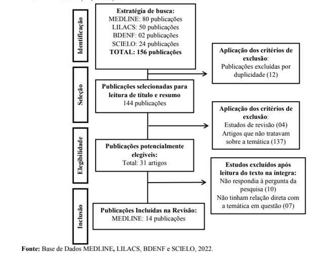 A partir das buscas realizadas nas bases de dados, 156 artigos foram encontrados. Do total, 54 encontrados na MEDLINE via portal PUBMED, 26 artigos na MEDLINE via BVS, 50 na LILACS, 2 na BDENF e 24 na SciELO. Desses, foram excluídos 12 artigos duplicados, selecionando os demais para a leitura do título e resumo, excluindo-se após a etapa de triagem, por não se enquadrarem nos critérios do estudo. A etapa de elegibilidade resultou em 31 artigos, após isto, incluíram-se 14 artigos no estudo, conforme o Fluxograma da Figura 1.