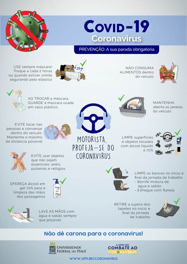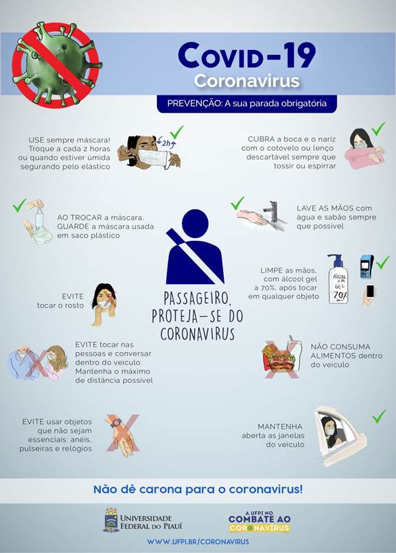 A pandemia da doença do novo coronavírus (COVID-19) representa ameaça à saúde pública mundial. O agente etiológico dessa doença, o coronavírus humano Severe Acute Respiratory Syndrome Coronavirus 2 (SARS-CoV-2), possui alto potencial de transmissibilidade por meio de secreções respiratórias e salivares e tem atingido todos os continentes, em mais de 200 países. Desse modo, medidas para controle da contaminação e redução das internações hospitalares devem ser adotadas(1-2). Os serviços de transporte para a mobilidade urbana e desenvolvimento de atividades econômicas essenciais. Todavia o transporte público e os veículos de transporte individual de passageiros por aplicativo são reconhecidos como ambientes de risco para a transmissão de COVID-19, pois possuem espaço físico limitado, confinado e superfícies compartilhadas entre pessoas não testadas(3).