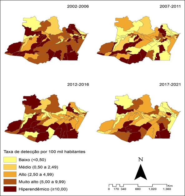 A taxa de detecção apresentou considerável redução, como visto nos estudos realizados na Bahia, em Goiás, em Manaus, e no Amapá (7,8,14,19). Entretanto, apesar dessa regressão sugerir diminuição da força de morbidade e magnitude da endemia, não implica em controle da situação epidemiológica, visto que o estado ainda se encontra em situação de alta endemicidade (21).
