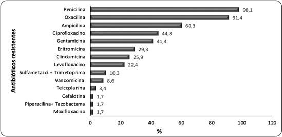 Em relação ao perfil de sensibilidade e à resistência dos SCN aos antibióticos testados, constatou-se maior resistência à penicilina (98,1%), oxacilina (91,4%), ampicilina (60,3%) e ciprofloxacin (44,8%). Os antibióticos com menor resistência foram cefalotina, piperacilina + tazobactama e moxifloxacino (Figura 1).