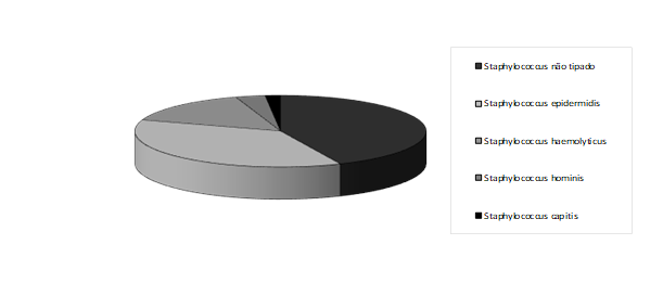 Apesar de não ser possível identificar uma parte das espécies dos SCN, verificou-se o predomínio da espécie Staphylococcus epidermidis. Resultado semelhante foi encontrado no estudo realizado quanto à resistência do Staphylococcus epidermidis, que observou 100% de resistência à penicilina e ampicilina, oxacilina (80%), eritromicina (69,6%), sulfametoxazol-trimetoprim (68%) e clindamicina (58,3%)(23).