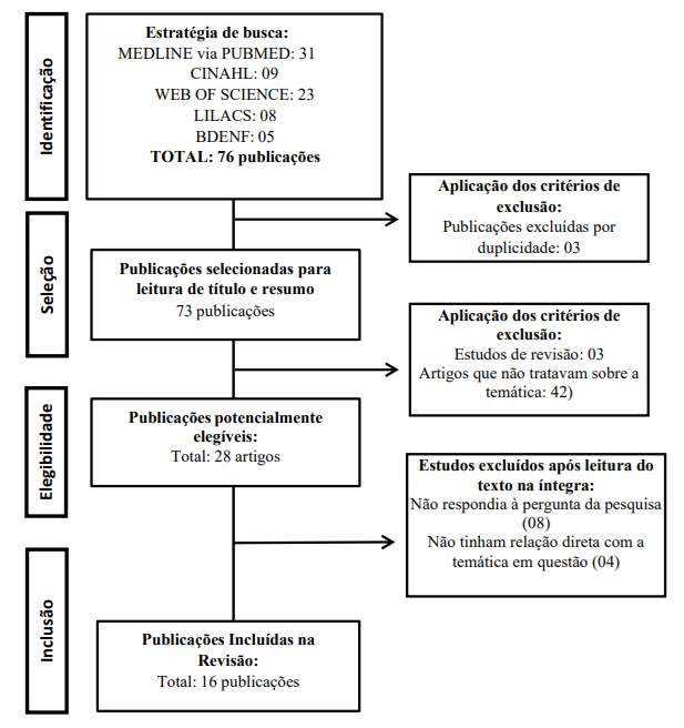 A partir das buscas realizadas nas bases de dados, encontrou-se 76 artigos. Do total, 31 encontrados na MEDLINE via PUBMED, 09 na CINALH, 23 na Web of Science, 08 na LILACS e 05 na BDENF. Desses, foram excluídos 03 artigos duplicados, selecionando os demais para a leitura do título e resumo, excluindo-se após a etapa de triagem, por não se enquadrarem nos critérios do estudo. A etapa de elegibilidade resultou em 28 artigos, após isto, incluíram-se 16 artigos no estudo, conforme o fluxograma da Figura 1.