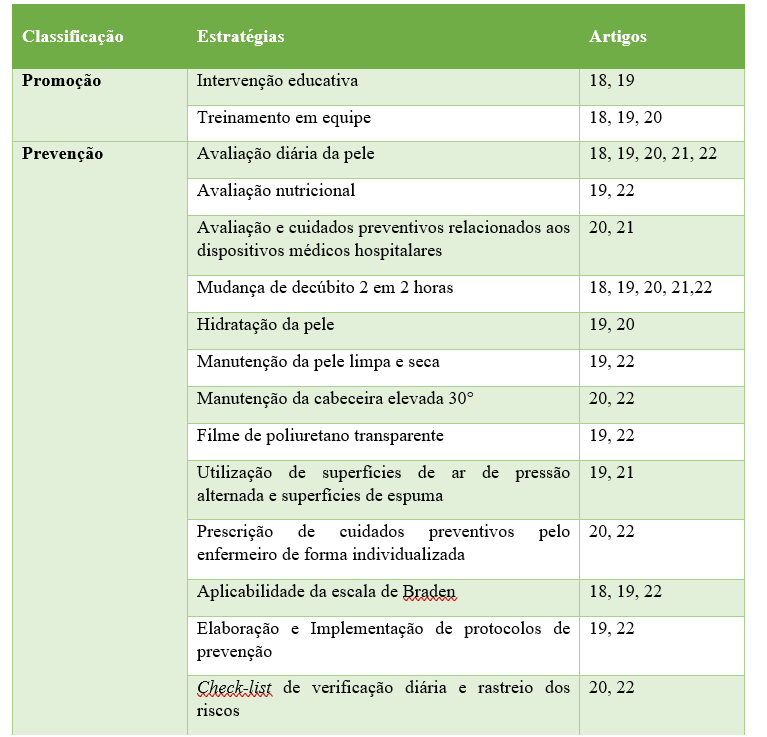 No que se refere as práticas assistenciais, estudos demonstram como padrão “ouro” intervenções como mudança de decúbito e posicionamento correto de duas em duas horas;(18-21,23) avaliação diária da pele para identificação de hiperemias;(18-20,25) uso de hidratantes, cremes de barreira e filme de poliuretano como coberturas primárias prevenção de lesão por pressão ou de sua progressão para estágio igual ou maior que o estágio dois; (22, 25) utilização de dispositivos para tratamento de incontinências, cuidados com a higiene do paciente e do leito;(21-25) nutrição rica em vitaminas e proteínas;(19) utilizar colchões de ar e quando possível colchões pneumáticos, (19,21,25) quando não contra indicado manter paciente com cabeceira elevada à 30°(21,24).