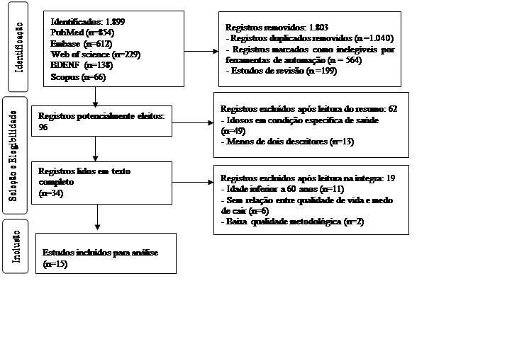 Para o processo de seleção final das publicações, foram definidos como critérios de inclusão: artigos disponíveis na íntegra, que abordem o medo de cair e a qualidade de vida de pessoas idosas com histórico de quedas; resumos que apresentem, ao menos, dois descritores compatíveis com os selecionados para o estudo; registros disponíveis na íntegra e na modalidade gratuita. Não foi definido marco cronológico para esse levantamento, seguindo recomendações PRISMA(13).