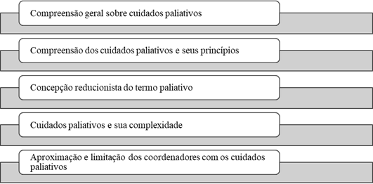 Durante o processo de análise e redução do texto às palavras e expressões significativas, a categoria “Cuidados paliativos na concepção dos coordenadores de cursos” possibilitou a construção de subcategorias. Os resultados alcançados são apresentados e discutidos de acordo com as comparações com a literatura científica atualizada sobre o tema.
