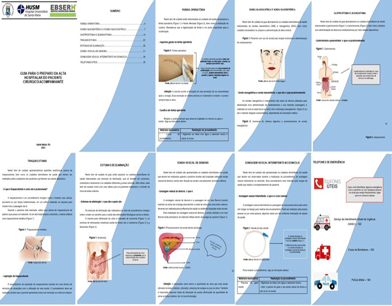 Nesse sentido, dispor de um material educativo e instrutivo facilita e uniformiza as orientações, com vistas ao cuidado em saúde. Estes podem auxiliar no cotidiano dos profissionais de saúde, e do paciente/cuidador, servindo como um complemento do cuidado no domicílio, já que durante a hospitalização se torna difícil assimilar tantas informações(9-10). Todavia, é imprescindível que estes materiais não substituem a interação e diálogo entre o profissional de saúde e o paciente/acompanhante, e sim sirvam de complemento no processo educativo.