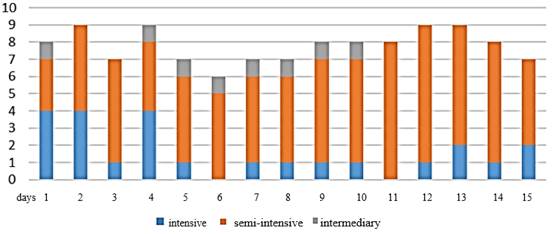 An intensive pace of nursing activities was observed, adjusting staffing to the daily patient demand. Between the days of the research, the occupancy rate varied between 60% and 90% of the total ICU capacity, with an overall average of 78% bed occupancy during the period. On 9 of the 15 data collection days, the occupancy rate reached 80% or more, allowing a fairly approximate assessment of the maximum nursing work capacity in the sector. On no day were the beds fully occupant, as can be seen in Graph 1.