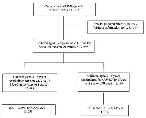 In addition to the above, there are few publications that sought to identify the epidemiological profile of children hospitalized for severe acute respiratory syndrome (SARS) due to COVID-19 and other pathogens in the state of Paraná that required the use of ICUs. Therefore, the present research aims to analyze the factors associated with hospitalization in intensive care unit (ICU) for severe acute respiratory syndrome (SARS) due to COVID-19 and other respiratory viruses in children from Paraná from 0 to 5 years old in the years 2020 to 2022.
