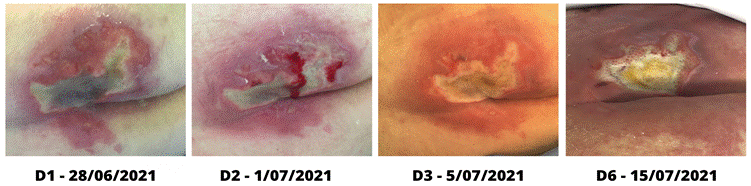 No dia 5 de agosto (D6 da Figura 2), sexto e último dia de tratamento, constatou-se diminuição da extensão da LP, que ainda permaneceu com a dermatite de contato na área perilesional, porém com evidente melhora. As bordas da lesão apresentavam-se maceradas em alguns pontos, espessas, e com presença de descolamento. O leito apresentava área de granulação brilhante e pequena área de tecido de esfacelo.