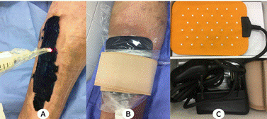 Legenda: A - lesão em face anterior da perna esquerda com aplicação de azul de metileno a 1% de concentração e irradiação com 9 Joules de luz vermelha; B - lesão em face anterior da perna direita com a placa de LED e fita elástica para uma fixação. C - modelo da placa de LED utilizada, com 36 pontos de LEDs acompanhada da fita elástica.