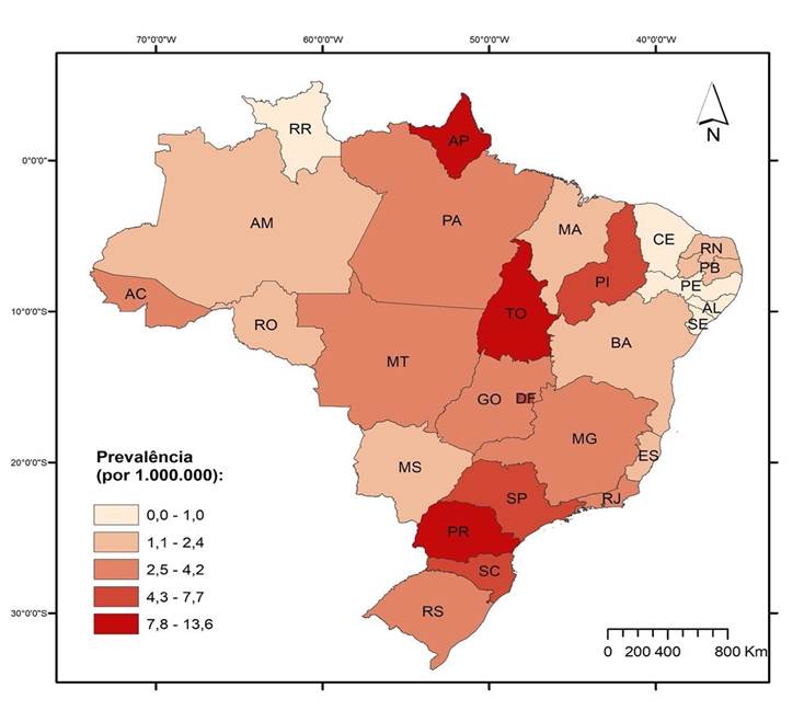 O estado que apresentou a maior prevalência foi o Amapá (13,6) com n=4, levando em consideração a população de mulheres em idade fértil desta localização, a prevalência ficou em seguido por Tocantins (11,8) e Paraná (9,2). Os estados com a menor prevalência foram Sergipe (0,0) e Roraima. A Tabela 1 demonstra a prevalência de gestante internadas em UTI com a doença, assim como a Figura 2 elucida esses resultados.