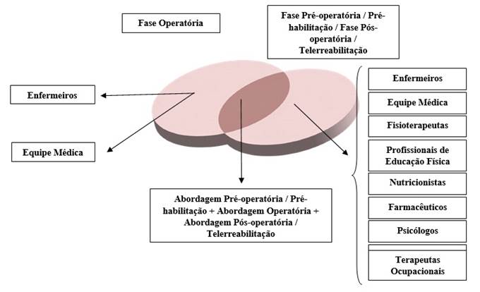 A amostra no Quadro 2 (22) dividiu-se em 4 categorias: fase de pré-habilitação cirúrgica (antecedente à cirurgia), fase de perioperatório cirúrgico, subdividida em abordagem assistencial e abordagem educacional e fase de telerreabilitação, como extensão da assistência interprofissional.