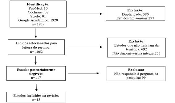 A busca nas bases de dados identificou 1939 registros, sendo o maior número no Google Acadêmico. Desses 1939 registros, foram incluídos na analise final da revisão 18 estudos que descreviam aplicação do PC na cicatrização de feridas em humanos. O tipo de estudo mais prevalente (Quadro 1) foi o do tipo relato de caso (15 estudos), seguido por estudo retrospectivo (2 estudos) e revisão sistemática (1 estudo). O processo de seleção está descrito por um fluxograma na Figura 1.