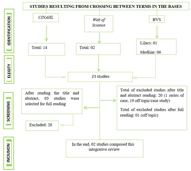 Thus, of the 23 publications identified in the databases (registries), after applying the eligibility criteria, 03 primary studies were selected for full reading and at the end 02 studies comprised the review sample. Data relating to those included can be viewed in Table 3.