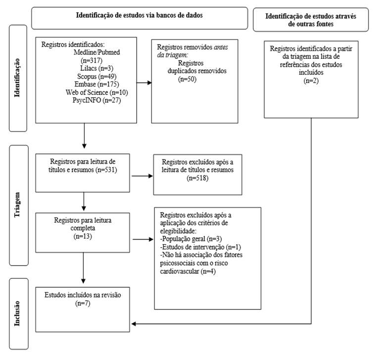 A busca inicial dos estudos resultou em 581 artigos. Dos quais se excluíram 50 artigos em duplicatas, restando 531 para leitura. De acordo com a triagem por meio dos títulos e resumos, excluíram- se 526 artigos e oito após a análise do artigo na íntegra, por não se enquadrar nos critérios de elegibilidade, incluindo cinco estudos por meio da busca nas bases de dados eletrônicas. Após a busca na lista de referências, adicionou- dois estudos, totalizando em sete artigos incluídos nesta revisão, como mostra a Figura 01.
