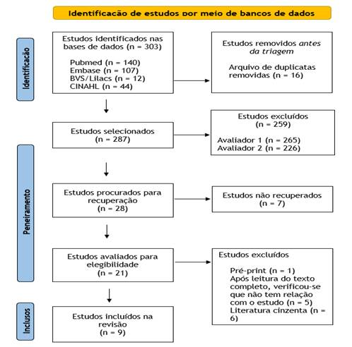 Após a realização das buscas nas bases de dados, 303 registros foram identificados. Foram removidas 16 duplicatas, totalizando 287 registros. Aplicados os critérios de elegibilidade já citados, foram selecionados 21 estudos para leitura na íntegra. Ao final, nove estudos foram incluídos nesta revisão. Com relação aos artigos não recuperados, foram realizadas tentativas de contato por e-mail com os autores, bem como solicitado ajuda de bibliotecários para o resgate, porém ambas as iniciativas não tiveram sucesso.