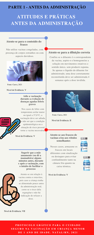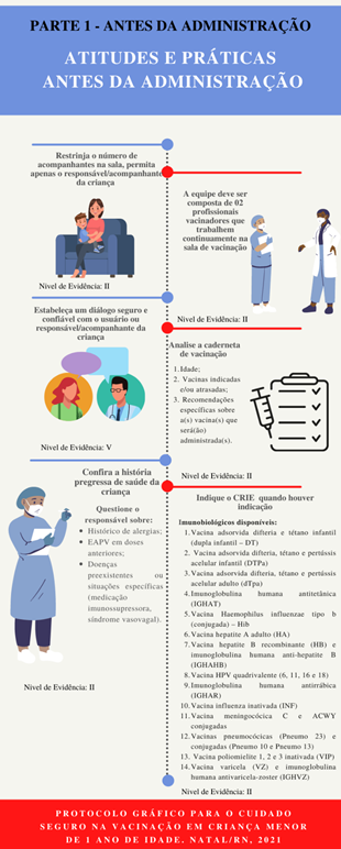 Em suma, ressalta-se a relevância do protocolo gráfico, pois visa a organização do processo de trabalho da equipe de enfermagem com vistas ao cuidado seguro na vacinação de crianças menores de 1 ano.