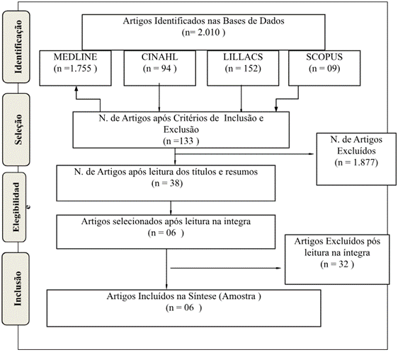 In the article selection process, an adaptation of the PRISMA (Preferred Reporting Items for Systematic Reviews and MetaAnalyses) recommendations was performed(13). Of the 2,010 publications identified, 1,877 were excluded because they did not meet the inclusion/exclusion criteria. A careful reading of the full text of the remaining 38 articles was performed to identify whether they answered the research question. Six articles met the study objectives and answered the guiding question, as detailed in Figure 1.