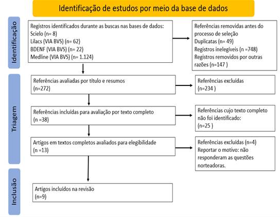 Os critérios de inclusão utilizados foram publicações disponibilizadas em texto completo, disponível na íntegra, gratuitamente, nos idiomas português, inglês e espanhol. Por se tratar de uma temática pouco abordada nas publicações científicas, optou-se por não delimitar um recorte temporal. E excluídos os artigos em duplicidade, editoriais, teses, artigos de revisão, comentários, notas prévias, manuais, livros, capítulos de livros, manuscritos e estudos que não abordaram o tema ou que não evidenciaram resposta à questão norteadora (Figura 1).