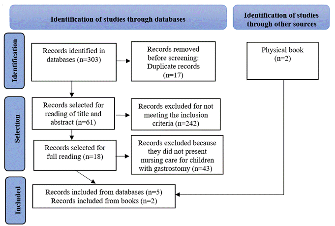 Controlled descriptors were selected to set up search strategies for the articles, which were extracted from the Health Sciences Descriptors (DeCS) and Medical Subject Headings (MeSH). Thus, the following strategy was used, with the help of the Boolean operator AND: “Nursing care” AND “Gastrostomy” AND “Pediatrics.”