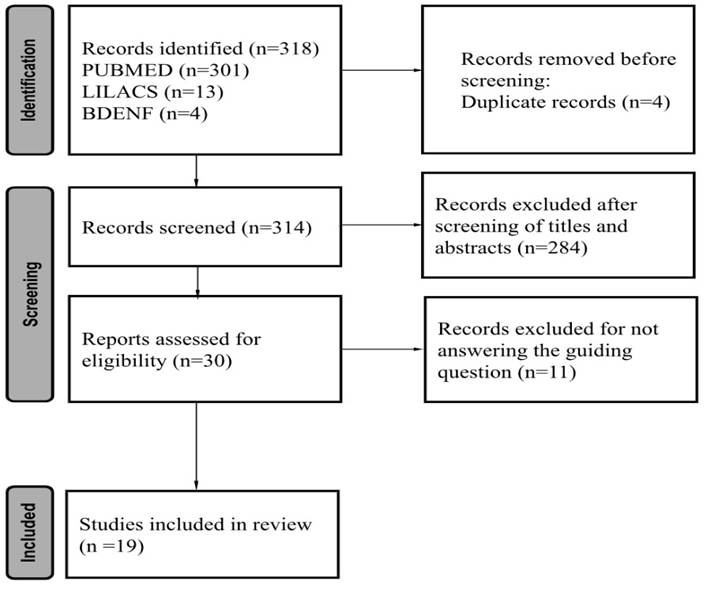 Based on the database search, 318 records were identified. After excluding duplicates and reading titles and abstracts, 30 articles were read in full; of these, 19 articles were selected to compose the final sample of the review. Figure 1 presents the flowchart for selecting the studies included in the integrative review.