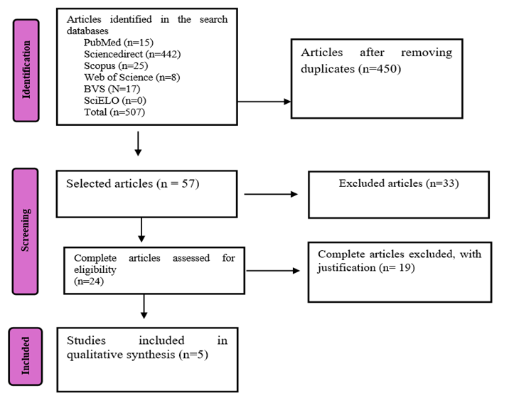 The inclusion criteria were articles in English and Portuguese, primary studies, studies that conducted original research with human beings, assessing the main theme of this review, and with no time frame delimitation. Secondary studies (narrative, integrative, and systematic reviews), gray literature (dissertations, theses, unpublished documents, conference reports, and/or scientific meetings), and articles that did not address the chosen theme were excluded. Data was collected using an organized instrument that contained authors’ names, year, study objective, methodology, and main results. Figure 1 demonstrates the process of identification, screening, and inclusion of articles.