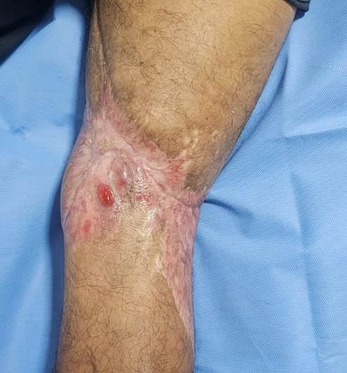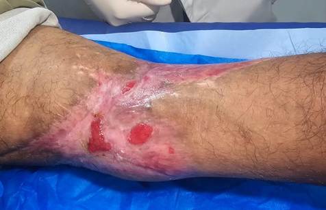Exame físico do membro inferior direito: membro com edema significativo quando comparado ao membro contralateral, endurecido, pulsos pedioso e tibial posterior palpáveis. Pele desidratada e com higiene precária. Observado hematomas extensos e isquemia no local da sutura e nas áreas adjacentes. No terço médio da ferida, havia drenagem de exsudato seroso espontaneamente, com discreto afastamento de bordas ao longo da sutura. Extensão aproximada de 25 cm x 18 cm em suas maiores dimensões (Figura 1).