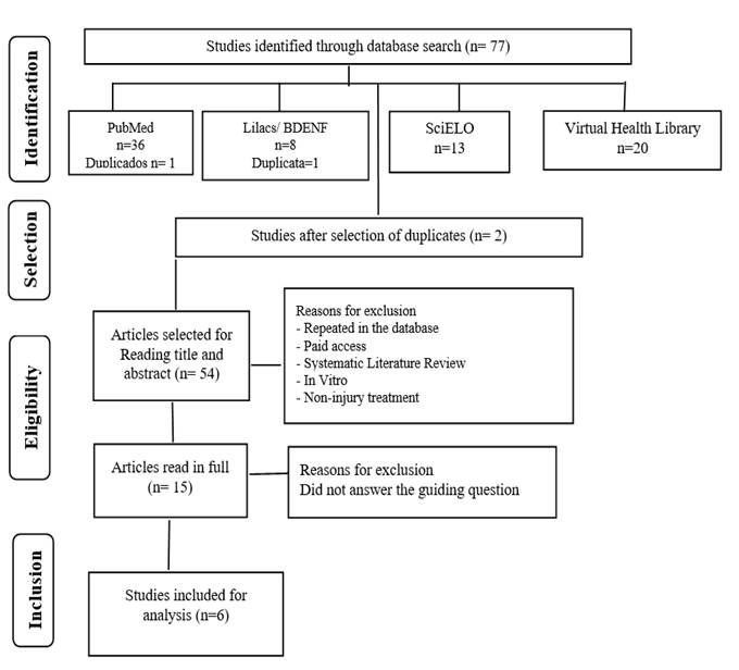 The first search performed by reading the title resulted in 77 articles. From the reading of the abstracts, 06 resulted in full reading. Descriptors in Portuguese were used for filtering Scielo, with laser therapy and wounds. The first search performed by reading the title resulted in 13 articles. From the reading of the abstracts, 03 resulted in full reading. In the Lilacs filtering, the descriptors Wounds and Injuries, Laser therapy, Bdenf database, controlled clinical trial, and published in the last 15 years were used. The first search performed by reading the title resulted in 3 articles. After reading the abstracts, they were discarded for not meeting the inclusion criteria. According to the flowchart: