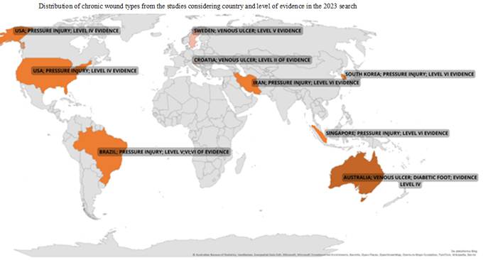 Figure 2 - Arrangement of types of chronic wounds in studies considering country and level of evidence in a search carried out in 2023.
