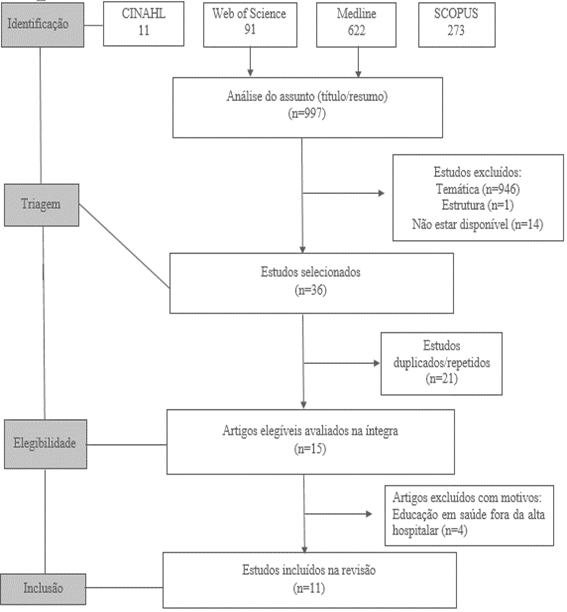 Foi utilizado o instrumento Preferred Reporting Items for Systematic Review and Meta-Analyses (PRISMA), para expor o processo de identificação, triagem, elegibilidade e inclusão dos estudos (Figura 1).