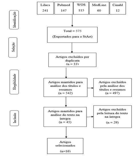 Foram identificados inicialmente 575 estudos nas bases de dados, desses, 33 foram excluídos por duplicatas e 497 a partir da leitura dos títulos e resumos, após a leitura do texto na íntegra, foram mantidos para a revisão um total de 16 estudos (Figura 1).