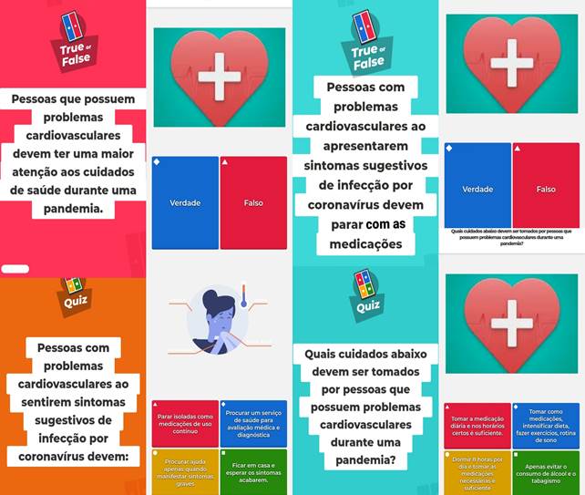 O QuizziCardio trata-se de um jogo que aborda inicialmente questões sobre a infecção por COVID-19 (local de início, tempo de incubação, modo de transmissão e prevenção) e em seguida, é abordado as formas e maneiras de cuidados com a saúde cardiovascular durante a pandemia trazendo questões sobre a prática de hábitos saudáveis (alimentação saudável, prática de atividade física, importância da rotina de sono, lazer). Este conteúdo foi inserido em 25 perguntas e sua aplicação com uma linguagem clara e objetiva para a compreensão de todos os públicos.