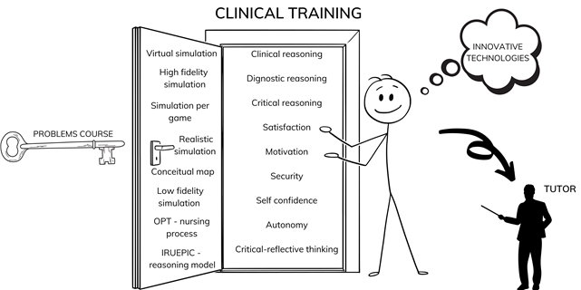 The figure below (Figure 2) summarizes what the articles in this RIL discuss about clinical training, that is, that teaching strategies are problematizing aimed at developing skills, as well as valuing the role of the tutor in the use of these strategies.