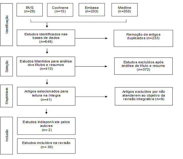 Foram identificados 646 artigos através da busca eletrônica nas bases de dados, porém, após análise criteriosa esta revisão integrativa foi composta por 32 artigos, sendo que 2 destes não estavam disponíveis para leitura na íntegra. Desta forma, esta revisão integrativa totalizou em 30 artigos que atendiam aos critérios de inclusão previamente estabelecidos.