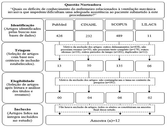 Na busca inicial, encontrou-se um total de 1158 publicações. Após a aplicação dos filtros, segundo os critérios de inclusão estabelecidos, e eliminação dos estudos duplicados, resultou-se em 204 estudos. Em seguida procedeu-se à leitura e análise dos títulos e resumos, e foram excluídos os estudos que não contemplavam o tema no contexto do problema de pesquisa (n=192), tais como sedação e uso de medicamentos em ventilação mecânica, cuidados de enfermagem não relacionados ao paciente em ventilação mecânica especificamente, fatores associados somente à ventilação mecânica não invasiva, desmame, estudos sobre condutas e conhecimentos de outros profissionais e outros temas não correlatos.