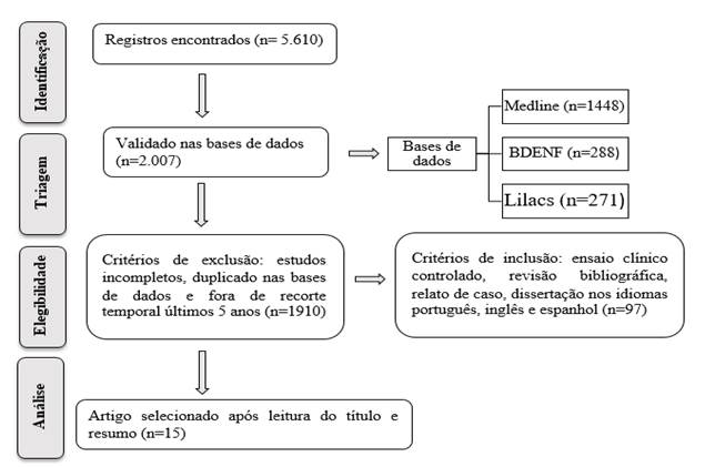 Em contrapartida, foram excluídos da pesquisa estudos incompletos, que não fazem referências ao objetivo do estudo, duplicados nas bases de dados e fora do recorte temporal. Ao final da busca, após aplicação dos critérios de inclusão e exclusão, restaram 97 artigos dos quais foram lidos título e resumo e agrupados 15 trabalhos para análise. A síntese metodológica dos achados da revisão integrativa foi agrupada em forma de fluxograma, conforme apresentado na figura 1.